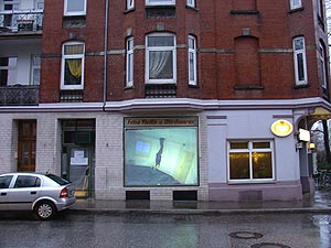 Friederike Rückerts Video entstand im Rahmen des Seminars Traum, das zur Zeit von Wim Wenders an der Hochschule für Bildende Künste in Hamburg gehalten wird. Der Regisseur und Dozent zeigte sich sehr angetan von der ersten Fassung, die nun in Zusammenarbeit mit Torsten Pinne vertont wird. Die Installation an einem öffentlichen Platz zu präsentieren, war ein gelungenes Experiment, zufällig vorbeigehende Passanten waren als aufmerksame Betrachter zu beobachten. Und so kann sich Friedrike Rückert vorstellen, weitere Installationen in frei einsehbaren Räumlichkeiten in der Stadt folgen zu lassen. (Daniel Krönke)