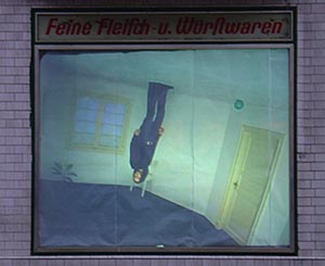 Verkehrtheroom - Videoinstallation von Friederike RückertIn den ersten Tagen des Februars wurden Passanten in der Hansastraße/Ecke Gutenbergstraße nach Einbruch der Dunkelheit durch ungewöhnliche Bilder zum Einhalten und genauem Hinschauen bewegt. Hinter einem großen Schaufenster schien der Blick frei zu sein auf ein fast leeres, weiß gestrichenes Zimmer, darin ein Stuhl und eine Pflanze. Zwei Türen und ein Fenster mit Blick auf blauen Wolkenhimmel deuten eine Welt außerhalb an. Der Raum scheint jedoch keinen physikalischen Gesetzmäßigkeiten zu unterliegen. Eine junge Frau hängt unter der Decke, versucht zunächst vergeblich auf den Boden zurückzukehren. Als ihr das nicht gelingt, beginnt sie, den Raum spielend zu erkunden. Sie kann jedoch nie die hermetische Welt des Zimmers verlassen.