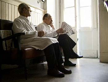 José de Sousa, schmallippig und hohlwangig, lässt in kerzengerader Haltung mit elegant gespreiztem Finger seine Schere leise klappern, während Armando de Oliviera sich als erste Pflicht des Tages den Sportteil vornimmt, die Kippe lässig im Mundwinkel. Noch bevor er im Bild erscheint, hört man, wie er das quäkende Radio einschaltet, worauf dem älteren José die unterdrückte Andeutung eines genervten Seufzers entfährt. Die Musik wird nun nicht mehr verstummen, und als beide dann gleichzeitig einen Kunden auf dem Stuhl haben, übernimmt der Film die Rumba-Rhythmen auf die Tonspur und verwandelt die Arbeit der beiden Kollegen in ein schwungvolles Duett, das möglicherweise auch ein stummes Duell ist. Wenn die Kamera wiederholt den Blick in die stumpfen, fleckigen Wandspiegel sucht, gewinnt man den Eindruck durch ein Fenster in eine vergangene Zeit zu blicken, und in dem winzigen Salon finden sich immer wieder kleine Stillleben aus Arbeitsgeräten, die die Atmosphäre eines lebendigen Museums unterstreichen. Interessant ist die Frage, wie es der Filmemacherin Mervi Junkkonen von der Hochschule für Kunst und Design in Helsinki gelungen ist, sich so frei und unaufdringlich in dieser kleinen, engen Männerwelt zu bewegen. |