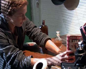Ausstatterin Maren Jaenisch bei der Arbeit Krönke interviewt Jaenisch zunächst vor der Szenerie eines stillen Sees, ein kompletter Kontrast zu den komplexen Bildern vom Set, und deutet damit bildnerisch den Prozess, eine Bücherwelt - Geistwelt jenseits von Natur - gänzlich aus dem Nichts zu schaffen. Ähnlich intuitiv und gleichzeitig geradezu symbolisch fotografiert Krönke die Kamerafahrt durch den Dachboden auf das Bücherregal, eine der eindrucksvollsten Szenen in Tödliche Roman(z)e. In raschen Schnitten aus verschiedenen Blickwinkeln auf diese Kamerafahrt, jeweils gegengeschnitten mit dem, was die Kamera dabei sieht, also den späteren Filmsequenzen, gelingt Krönke ein dynamisches Bild des Entstehungsprozesses, das filmdramaturgisch der gezeigten Fahrt in nichts nachsteht.