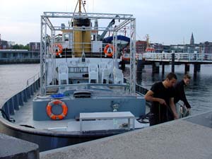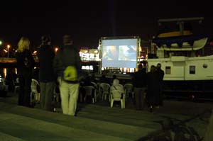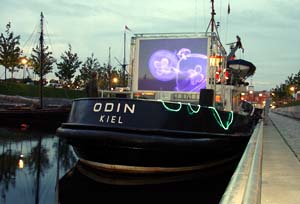 Die Odin legt ab ... Der Beamer für die Projektion kam vom Kieler Offenen Kanal (Kiel TV), die Stühle borgte das private Kieler Theater Die Komödianten aus, das städtische Kulturamt kam für den Sprit des Schiffes auf. Weitere Sponsoren zeigten sich großzügig. Das Wetter spielte im Großen und Ganzen mit, wenn auch mit kleinen Abstrichen: Samstags nieselte es anfangs noch und am Sonntag war es doch relativ kühl. Die unterschiedliche Open-Air-Kino-Situationen an den jeweils immer anderen Anlegeorten, die die Odin ansteuerte (freitags: Museumshafen, samstags: Anleger Bellevue, sonntags: Hörncampus), forderten die Macher zu unterschiedlichen Vorführlösungen heraus. Mal war die Leinwand achtern auf der Stirnseite des Dampfers gespannt, mal längs auf der Steuerbordseite; mal saßen die Besucher an Bord, mal schauten sie sich von Land aus die Filme an. Da auch die Zuschauer mitspielten und in Scharen kamen, waren die Veranstalter zufrieden. Ihr Idealismus hatte sich gelohnt.