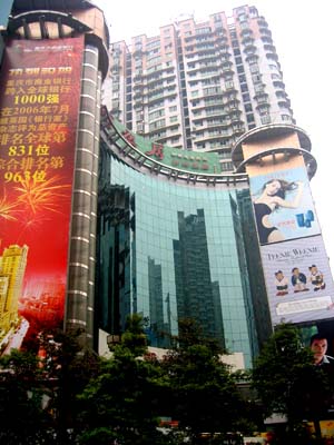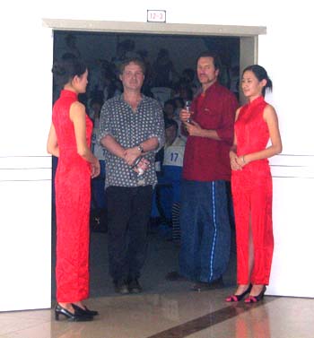 „erschreckend offizieller" Empfang: Karsten Weber (links) und Phil Conyngham am Eingang des Hörsaals Das Land, das nun die Welt mit DVD-Playern ausrüstet, schien selbst technisch nicht so gut ausgestattet. In dem Medienraum fand man die Fernbedienung zu dem einzigen DVD Spieler nicht und dann fehlte auch noch der Adapter zu dem Tonausgang des Laptops, das von dem Podium aus bedient werden sollte. Welch ein Sound dann die Filme untermalte, mag ich nicht näher beschreiben, denn man drehte zwei Podiumsmikrofone an die winzigen Lautsprecher des Notebooks. Wir wurden jedoch nicht mit Schimpf und Schande verjagt, sondern die Unileitung lud uns in ein Nobelrestaurant. Ein Professor für Animationsfilm drückte uns die Hände mit den Worten, wir hätten seinen Unterricht und die Filme der Studierenden für alle Zeiten verändert. Die Studenten hätten ihre Furcht vor dem unerreichbaren Perfektionismus des Westens verloren, da sie nun gesehen hätten, dass der Westen auch eine andere Seite der Medaille besitzt, die von Perfektion nichts wissen will. In diversen Gängen kämpften wir mit unseren Stäbchen mit Jangtse-Wels, Hühnerfüßen und rohem Tintenfisch während die Repräsentanten der Uni und ein Sekretär der Kommunistischen Partei uns mit Trinksprüchen auf Mao, Marx, den deutschen Fußball und die Freundschaft vom Jangtse bis an den Rhein eindeckten. Da sahen wir uns gezwungen nicht weniger schwülstig das Glas zu heben auf unsere Einladung, auf die chinesische Gastfreundschaft und den internationalen Kulturaustausch. Und dann wurde es auch schon ernst. Es wurden Pläne geschmiedet ein chinesisches Kurzfilmprogramm nach Deutschland zu schicken und im nächsten Jahr mit uns ein deutsches Filmfestival in Chongqing zu organisieren. Die folgenden Veranstaltungen wurden von Haus-M-Commune wegen des großen Interesses aus ihren Galerieräumen in eine Produktionshalle einer ehemaligen russischen Fabrik gelegt. Es wurde auch noch schnell eine Leinwand mit entsprechenden Ausmaßen geschneidert. „Faites vos jeux“ hatte als Film, der auschließlich aus raubkopierten Bildern besteht, für China wohl eine besondere Bedeutung. Das Publikum war sich aber alles andere als einig über den Film. Man kritisierte die fehlende gradlinige Geschichte oder fühlte sich provoziert durch die ruppige Bildbearbeitung und den aggressiven Soundtrack, was einige Jugendliche genau entgegegesetzt sahen. Sie erkannten ihr eigenes Lebensgefühl auf der Leinwand und den Zusammenprall der eigenen Innenwelt mit dem so genannten Lauf der Welt. Man stellte politische Fragen, ob wir die Situation Chinas als etwas grundsätzlich anderes betrachten würden und ob wir einen Rat hätte, wie man sich denn sich als oppositionell fühlender Mensch in übermächtigen Verhältnissen verhalten soll. Vielleicht gelang es uns zu vermitteln, dass wir uns in der Hilflosigkeit sehr verwandt waren, egal wie sehr sich unsere Kulturen unterscheiden mögen. Und so sehr jeder Chinareiseführer davor warnt mit Chinesen über Politik zu diskutieren, so sehr schnitten die Zuschauer selbst bei dem folgenden Konzert mit Multiprojektion politische Fragen an. Mit der URBAN CHAOS Performance thematisierten wir das Eigenleben der Großstädte und mischten vorbereitete Zusammenschnitte von Fritz Langs Aufnahmen von Berlin, vom Bauboom im alten Detroit, von der Großbaustelle am Potsdamer Platz und vom erleuchteten Shanghai und mischten diese mit Aufnahmen, die wir gerade von Chongqing gemacht hatten.