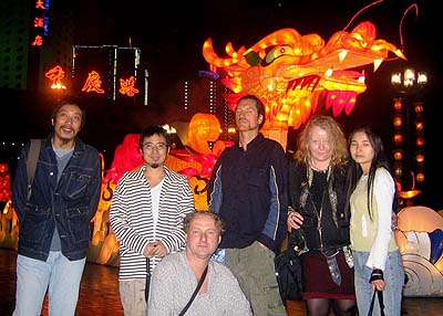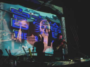 „Urban Chaos“ multimedial (im Vordergrund: Phil Conyngham mit Didgeridoo) Wir hatten auch Dias vorbereitet auf denen Schlagworte wie „Moloch“, „Profit“ oder „Obdachlosigkeit“ ins Chinesische übersetzt waren. Die mit Hilfe des Videomischers verfremdeten Bilder waren selbst in unseren Augen beeindruckend und es schien, als gäbe es ein lange minutiös vorbereitetes Zusammenspiel der chinesischen Elektronikmusiker, des australischen Didgeridoo-Virtuosen und unseren Projektionen. Es waren nicht nur diverse Fotohandys und Digitalkameras auf das Geschehen auf der Bühne gerichtet, man erkannte in diversen zufälligen Bildkombinationen tiefe Aussagen. „Wolltet ihr mit dem Wort ’Babylon’ über dem Financial Place von Chongqing sagen, dass der Versuch zu hoch hinaus zu wollen bitter bestraft wird?“ Die Fragen setzten sich auch in verschiedenen Journalistengesprächen fort. Als einer der Journalisten nach dem Interview noch persönliche Fragen nach Falun Gong stellte, verließ unsere Übersetzerin den Raum und beendete das Gespräch abrupt. (Karsten Weber, Filmgruppe Chaos) |