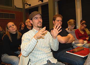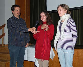 Mona Winkel (22) und Isabelle Chaplot (21) stellen sich den Fragen von Moderator Ingo Mertins. Mit ihrem Film „2/3“ landeten die Studentinnen am Ende auf dem ersten Platz. Über 500 Euro konnten sich Filmemacher Christoph Dobbitsch (21) aus Kiel und seine Crew freuen. Ihr Film „Fliegenfänger“ überzeugte die Jury vor allem durch die bestechende Aufmachung und die besonders gelungene künstlerische Gestaltung. „Der Film hebt sich von dem Schema dieses Programms ab“, erklärte Juror Hauke Lange-Fuchs von den Nordischen Filmtagen. Die ungewöhnliche Thematik des Streifens lässt zahlreiche Interpretationen zu. Den Inhalt ließ Nachwuchsregisseur Christoph Dobbitsch, der in Kiel Philosophie, Medien und Englisch studiert, nach dem Film offen.