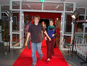 Roter Teppich sorgt für einen Hauch von Hollywood: Der Eingangsbereich des Festsaales in der Internationalen Bildungsstätte Jugendhof Scheersberg (Fotos: Jörg Jacobsen) Auf dem ersten Platz landeten Mona Winkel (22), Isabelle Chaplot (21) und Sebastian Joos (22) aus Holm bei Uetersen. Mit ihrem Kurzfilm „2/3“ über Liebe und Freundschaft zwischen drei jungen Menschen erinnerten sie an das französische Kino, sagte Laudator Claus Oppermann. Der professionelle Kameramann einst selbst Teilnehmer beim Landes-Jugend-Video-Wettbewerb lobte die stimmige Umsetzung, die ganz ohne Plattitüden auskomme. „Der Film war sehr dicht an den Schauspielern“, so Oppermann. Der Nachwuchspreis ist mit 750 Euro dotiert.