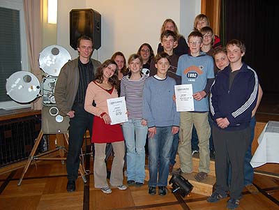 Stolz präsentieren die Gewinner ihre Urkunden. Auch in anderen Medien wurde in diesem Jahr von den Feierlichkeiten auf dem Scheersberg berichtet. Neben den Journalisten der großen Zeitungsverlage im Land tummelten sich auch ein Team von Kiel TV und eine komplette Rundfunk-Redaktion des Offenen Kanals Westküste in Quern. Das Programm des Video-Film-Festes Schleswig-Holstein zeichnete sich in diesem Jahr erneut durch eine gestiegene Professionalität in der Arbeit mit dem Medium Film aus: „Wir waren sehr beeindruckt von der Qualität der Filme“, lobte Jury-Vorsitzender Hauke Lange-Fuchs. Das bedeutendste Filmfestival für die jugendlichen Medienmacher im Land hat sich in den vergangenen 17 Jahren als interessante Nachwuchsfilm-Börse einen Namen gemacht. Rund 150 Schüler, Studenten und junge Berufstätige aus dem ganzen Land präsentierten ihre neuesten Filmproduktionen. Insgesamt hieß es von Freitag bis Sonntag etwa 40 Mal „Film ab!“. Im Werkstatt-Programm wurden der Animationsfilm „Glück im Unglück“ von Kathrin Wahl (16), der nicht ganz ernst zu nehmende Dokumentarfilm „abgelegen Ein Leben am Rande der Zivilisation“ ebenfalls aus Dithmarschen und der Märchen-Horror-Schocker „Schwesterherz“ von Christian Ahlers (20) ausgezeichnet. Auch das Publikum konnte einen Preis ausloben. Die Zuschauer stimmten mehrheitlich für die Heine-Gedichtverfilmung „Hurt“, die von einer Schülergruppe der Meldorfer Gelehrtenschule eingereicht worden war.