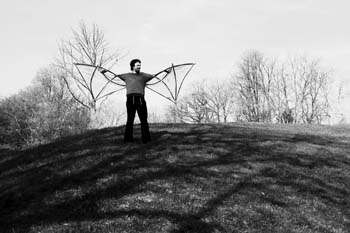Kein Spaß mehr (Still aus dem Film) „Ich selber bin eine Organisations-Niete. Alles was ich konnte, war mich auf mein Team zu verlassen. Dass Bilder, die ich vor mehr als drei Jahren im Kopf hatte, jetzt wirklich da sind, für alle sichtbar, ist wie ein Wunder. Ich versteh’ das nicht. Ich hatte immer das Gefühl, nur sagen zu können, was ich wollte. Dass das letztlich funktioniert hat, ist wirklich irre!“, freut sich Jan-Gerrit Seyler. Jetzt endlich hat das Ensemble-Stück seine Premiere. Wer neugierig ist, dem ausgestellt und zugleich versteckten Protagonisten, verkörpert durch den Kieler Schauspieler Steffen Lorenz, tief in den Sehschlitz seines Pappkostüms zu blicken und mit seinen Augen aus den Tiefen des Handys hinaus in die Kieler Innenstadt zu sehen, ist herzlich zur Open Air Doppelpremiere am Samstag, 25. August, 20 Uhr im Kieler Klostergarten Café (Falckstr. 9, gegenüber der Falck-Wache) eingeladen. Sobald es dunkel wird, geht’s los. Bei schlechtem Wetter findet die Premiere in der Pumpe (Haßstr. 22) statt. Und wieso „Doppelpremiere“? Weil nicht nur Seylers „Handycap“ dort Premiere feiert, sondern auch ein weiterer Kurzfilm aus Kiel: „7 Versuche zu Fliegen“ von Sarah Roloff. 7 Versuche zu Fliegen Der nächtliche Traum vom Fliegen lässt Sebastian nicht mehr los und so versucht er mit Beharrlichkeit und Optimismus alles, um sich von der Schwerkraft freizumachen; unterstützt durch einen treuen Gefährten und festgehalten von einer befreundeten Dokumentarfilmerin.