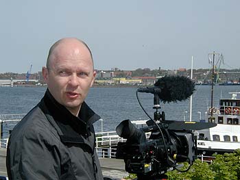 Kai Zimmer beim Dreh (Foto: jm) So zieht Zimmer seit Juni durch die Kieler Hafenlandschaften, ausgestattet mit Foto- und Filmkamera, aber auch einem digitalen Tonaufnahmegerät. „Ganz bewusst intuitive“ Vorstudien für einen Film, bei dem „Kiel eigentlich nur Kulisse ist“. Zimmer will keinen klassischen Kiel-Film drehen, kein Stadtporträt. Gleichwohl werde man Kiel zumindest als Kieler in jedem Ton und jedem Bild wiedererkennen. Beide sind für eine der wenigen Hafenstädte, in der Hafen und Innenstadt quasi ein und derselbe Ort sind, einfach typisch und unverwechselbar. Etwa das surreale Bild, das man einfangen kann, wenn man von der Altstadt gen Förde schaut und „Schiffe wie Häuser, die durch die Straßen fahren“, sieht. Oder die Gangways, die sich „wie Nabelschnüre“ mit dem Ostseekai und damit der Stadt verbinden. Zimmer fotografiert und filmt derlei mit dem Teleobjektiv. Ihm geht es um den Ausschnitt, nicht das Panorama, „das Verhältnis von nah und fern, hell und dunkel, außen und innen“.