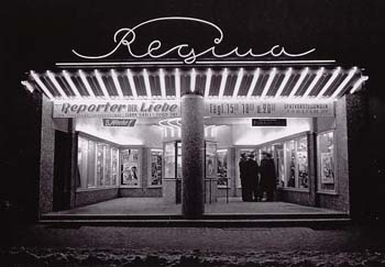 Fassade des „Regina“ in den 50er Jahren Horst Schäfer schrieb über den Film im Fischer Film Almanach 1995: „Mit trockenem Humor, ironischen Schnitten und melancholischem Blues rekonstruiert und visualisiert Helmut Schulzeck die Vita des Kieler Kinos „Regina“ von 1956 bis 1990; vom Filmkunsttheater zum Kinokettenglied und dann zum Programmkino. Erinnerungen von Kinomachern und Stammbesuchern bestätigen, dass Kinogeschichte auch Lokalgeschichte und Familiengeschichte ist. Die Kieler Mutmaßungen, Wahrnehmungen und Wertungen über Programme und Publikumsresonanz stehen für die Bedeutung vieler vergleichbarer Kinos, deren Kino-Lichter endgültig ausgegangen sind. Was Kino als Treffpunkt bedeutet, was sich an Freud und Leid zugetragen hat, sich an Pannen, Skandalen, Provokationen und Demonstrationen ereignete das alles findet sich hier wieder, sorgfältig und liebevoll aufeinander abgestimmt, informativ und unterhaltend, aufschlussreich und atmosphärisch stimmig. Das „Regina“ heißt heute Commerzbank. Allen noch übriggebliebenen Nachbarschaftskinos möge dieses Schicksal erspart bleiben: Gut Licht! Gut Ton! Und volle Kassen!“ (Produktionsmitteilung) |