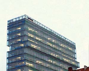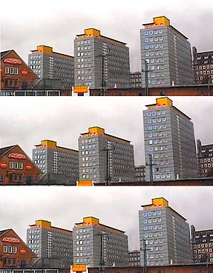 Der Anblick hüpfender Häuser ist beunruhigend, aber weder Erdbeben noch Abrissbirne oder Al Kaida sind im Spiel: die Bauwerke fügen sich brav dem Groove der lässigen Gitarrenklänge und wagen sich nicht hinaus über die archaisch tektonischen Dimensionen des Auf und Ab, des Rechts und Links. Sogar die drögen, grauen City-Hochhäuser am Klosterwall mit ihren gelben Dachgeschossen machen eine gute Figur als steinerne Revuegirls.