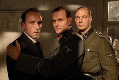 Meisterfälscher Sorowitsch (Karl Markovics, links) mit Lagerkommandanten Herzog (Devid Striesow) und SS-Mann Holst (Martin Brambach) (Foto: Berlinale) Letztlich „hilft“ nur die brutale Gewalt der KZ-Wächter über diese Klippe der Handlung hinweg. Und als dann die Dollars doch noch gedruckt werden, ist der Krieg praktisch schon fast zu Ende, jedenfalls für die KZ-Insassen und ihre Bewacher. Der Befreiung der Lagerinsassen geht natürlich die Abrechnung mit dem habgierigen Kommandanten voraus, als alle anderen SS-Leute schon geflohen sind. Und dann ist „Stunde Null“, mit all der Trauer um das Elend der Opfer. Ja, vielleicht haben sich viele einzelne Geschehnisse tatsächlich so zugetragen, wie im Film und in der Autobiografie August Burgers beschrieben, die die stoffliche die Grundlage für den Film lieferte. Aber dennoch wirkt der Film in vielen Dingen zu klischeehaft. Das Häftlingspersonal wird als große Familie dargestellt. Dem besonnenen Pragmatiker Sorowitsch wird der heißspornige Idealist Burger gegenübergestellt, dem opportunistisch berechnenden Lagerkommandanten Herzog sein bestialisch brutaler Untergebener und Überzeugungstäter SS-Mann Holst (Martin Brambach). Bezeichnend für die Klischeehaftigkeit auch Anfang und Ende: Die Rahmenhandlung zum eigentlichen Geschehen bildet das weitere Schicksal von Salomon Sorowitsch. „Gestrandet“ mit einem Koffer voller Falschgeld an den Gestanden von Monte Carlo, gewinnt er zunächst noch eine Menge Geld dazu, um dann alles absichtlich zu verspielen, aber vielleicht das Glück in der Gestalt einer jungen Frau zu gewinnen. (Helmut Schulzeck) Die Fälscher, D/Ö 2007, 98 Min., 35 mm. Buch, Regie: Stefan Ruzowitzky, Kamera: Benedict Neuenfels, Schnitt: Britta Nahler |