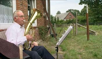 Hans-Hermann mit seinem Tenorhorn (Foto: NFL) Oder wir machen die Bekanntschaft mit Susanne, die mit Ausdauer und Fleiß Tenorsaxophon übt und spielt, aber um die Grenzen ihres musikalischen Könnens weiß. Auch sie findet in der Kapelle Gemeinschaft und Freude, die ihr über die Probleme ihrer Scheidung hinweghelfen. „Natürlich“ gibt es auch den ehemaligen Berufsmusiker (Heinz am Schlagzeug), der letztlich jedoch nicht der Karriere wegen nach Hamburg ziehen wollte, sondern dem Landleben und der Liebe zu seinen Tieren den Vorzug gegeben hat. Nach jahrelangem Tingeln in Bands und Begleitorchestern begnügt er sich heute zufrieden mit seinem Dasein als Freizeitmusiker. Es ist schon erstaunlich, welch unterschiedliche Charaktere Hubert in der Feuerwehrkapelle aufgetan hat, und dass alle so bereitwillig über ihr Leben erzählen, ein wenig schüchtern, doch letztendlich sehr offen, wie es sich besonders an Erwin zeigt, der selbstbewusst von seinem Kampf gegen die Alkoholsucht erzählt und wie er wieder in der Gemeinschaft seiner Feuerwehrkameraden Fuß fassen konnte. Dass die Biographien bisweilen für den Geschmack des Rezensenten ein wenig zu kurz geraten sind, ist dem relativ großen Querschnitt geschuldet, den Regisseurin und Autorin Hubert erfassen wollte. Alle vorgestellten Feuerwehrmusikanten lieben ihre Musik und Heimat. Und: sie ruhen in sich, trotz der Widrigkeiten, die das Leben auch hier für sie bereithält. Huberts Heimatfilm bringt dies beschau- und anschaulich rüber. (Helmut Schulzeck) „Das Dorforchester“, D 2007, 65 Min. Buch, Ton und Regie: Antje Hubert, Kamera: Barbara Metzlaff, Schnitt: Magdolna Rohkob, Produktion: Kathrin Lemme, Redaktion: Barbara Denz (NDR). Gefördert durch die MSH Gesellschaft zur Förderung audiovisueller Werke in Schleswig-Holstein mbH und durch die Kulturelle Filmförderung Schleswig-Holstein e.V. Seine Kinopremiere feiert der Film „Das Dorforchester“ am Freitag, den 11.1.2008 in Kiel, im Kommunalen Kino in der Pumpe, Haßstr. 22. Zur Feier des Tages gibt es Livemusik. Die 30 Personen starke Feuerwehrkapelle aus Jevenstedt spielt auf. |
