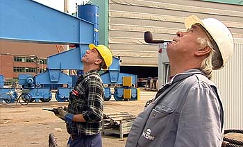 Gespannte Blicke, ob die „Katze gut“ ist ... (Foto: Fredo Wulf) Dennoch haben Wulf und seine Kameramänner nicht einfach nur „draufgehalten“. Bevor er mit Volker Tittel und Rainer Komers auf die Werft ging, war Wulf dort drei Monate auf Recherche und „war ein Teil des Teams der Schiffbauer“. So hat er „Vertrauensverhältnisse“ mit den HDWlern aufgebaut, die im Film ungemein unmittelbar als sie selbst erscheinen. Während vordergründig die Geschichte des Umbaus des Krans erzählt wird, gewinnen die Akteure, die „Kranmänner“, persönliches Profil. Das ist die Stärke dieses Dokumentarfilms. Etwa wenn Betriebsrat Michael Uprichard von den harten Zeiten der Massenentlassungen erzählt und man ihn hernach „ganz privat“ erlebt, wie er Folksongs aus seiner nordirischen Heimat singt. Oder Ralf Hartmann, der der Entlassungswelle zum Opfer fiel, aber nun wieder als Zeitarbeiter auf „seine HDW“ zurückgefunden hat freilich wieder um seinen Job bangend. Nicht zu schweigen vom dienstältesten Kranfahrer Dieter Nehls, der oben in der Kanzel des „Krupp“ von den alten Zeiten erzählt, aber auch noch nicht weiß, wie und wann er nach 45 Jahren auf der Werft in Rente gehen kann. Und Mustafa Eris, der sympathische Chef der Anschläger, der seinen Kollegen zu seinem Urlaubsanfang Döner in der Kranbude kredenzt. Am Ende hat der Kranumbau geklappt, der „Krupp“ hat seine Katze wieder „gut“. Ein Happy End für einen Film, der ganz nah dran ist an Kiel, Kiels Werft und an den Menschen, die dort nicht nur arbeiten, sondern auch leben. (jm) „Katze gut 9 Wochen auf der Kieler Werft HDW“, D 2007, DigiBeta 16:9, 75 Min. Buch/Regie/Ton: Fredo Wulf, Kamera: Volker Tittel, Reiner Komers, Schnitt: Margot Neubert-Maric. Koproduktion: NDR Fernsehen, Redaktion: Bernd Michael Fincke. Gefördert von der MSH und der Kulturellen Filmförderung S.-H. Kiel-Premiere am 17.11., 20 Uhr im Metro. Weitere Aufführungen am 18.11., 11 und 13 Uhr, sowie 19. bis 23.11., 19 Uhr. DVD-Bestellung und Filminfos unter www.fredo-wulf.de. |