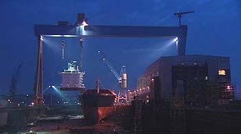 „Kollege“ Kran in Aktion (Foto: Fredo Wulf) Fredo Wulf, Kieler Dokumentarfilmer, hat sie in seinem Film „Katze gut 9 Wochen auf der Kieler Werft HDW“ begleitet, wie sie bangen und hoffen, dass die Modernisierung des Krans, ihres wichtigsten „Kollegen“, termingerecht gelingt. „Ich bin in Bremerhaven und Kiel aufgewachsen, zwei Städten, die von Schifffahrt und Schiffbau geprägt sind“, erzählt Wulf. „Da lag es nahe, dass ich irgendwann mal einen Film über die Arbeit auf der Werft machen wollte.“ Das Meer, die Schiffe hat er sich selbst buchstäblich „erfahren“. 1991 heuerte Wulf auf einem Fischkutter auf der Nordsee an. Darüber hätte er auch einen Film machen können, „aber es interessierte mich mehr, die Klischees über Schiffbauer muskelbepackte Arbeiter, die mit der Bierbuddel in der Hand dem Stapellauf zusehen zu demontieren.“ Die Kranfahrer und Anschläger, die Wulf wie den Umbau des „Krupp“ im Sommer 2006 porträtiert, sind zwar raue Gesellen, die in der „Kranbude“ manchen bärbeißigen Witz reißen, aber ebenso feinfühlig, wenn sie hunderte Tonnen schwere Schiffssektionen millimetergenau manöverieren. Der Film über die „HDWler“, denen „diese corporate identity wie ins Stammbuch geschrieben ist“, hätte ganz gewöhnlich werden können. Doch Wulf wollte, obwohl sein Film vom NDR Fernsehen koproduziert wurde (die Hauptfördergelder stammen indes von der MSH und der Kulturellen Filmförderung S.-H.) „keine Dokumentation machen, sondern einen Dokumentarfilm“. Während Dokumentationen Antworten liefern, wolle ein Dokumentarfilm „eher Fragen aufwerfen, die sich der Zuschauer aus dem Gezeigten selbst beantworten muss“. „Direct Cinema“ heißt Wulfs Credo: Der Filmemacher beobachtet und greift so wenig wie möglich in das Geschehen ein. „Am besten, wir sind als Filmteam unsichtbar.“ Eine Art „Dogma“, wie das in den 90er Jahren für den Spielfilm formuliert wurde: „Kein künstliches Licht, bewegliche Handkamera, schlankes Aufnahmeteam, keine Inszenierung.“ Denn: „Das Material ist intelligenter als der Filmemacher.“
