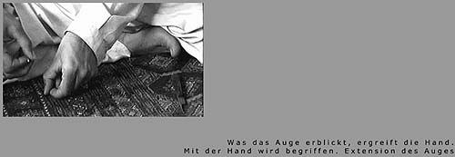 Das Handgreifliche der BilderRené J Goffins Kurze Ethnologie der Bilder bei netzpflege.netWas das Auge erblickt, ergreift die Hand. Mit der Hand wird begriffen. Die Bilder, die der Kieler Maler und studierte Ethnologe René J Goffin in die Internet-Galerie www.netzpflege.net (kuratiert vom Kieler Komponisten Hauke Harder) gestellt hat, zeigen in Animationen bewegte Hände fremder Kulturen, kurze Snapshots aus ethnologischen Videos, die er in Südostasien drehte. Die Hand eines Webers, von Gestikulierenden und Hände, die sich im Tanzritual tastend auf Schultern legen. Philosophische Texte der Wahrnehmungstheorie illustrieren die Bilder.![]() Die Hand als Kralle, Zange, Sensor und Zeichen ist für Goffin das zentrale Werkzeug, sich mit Welt in Beziehung zu setzen, sie buchstäblich und als vor allem leiblich konstituiertes Wesen in ihrer Leiblichkeit zu be-greifen. Dass die ganzheitliche Wahrnehmung von den so genannt niederen Sinnen wie Taktilität weit stärker geformt wird als von den höheren Sinnesfunktionen des Sehens und Hörens, wird in der Wahrnehmungspsychologie seit längerem diskutiert. Goffin greift diesen wissenschaftlichen Diskurs auf, um ihn mit dem künstlerischen Mittel des Bildermachens in Beziehung zu setzen, genauer sich mitten in die Fuge zwischen den Erkenntnismedien Wissenschaft und Kunst zu begeben.In der industrialisierten Welt, besonders in dem von dieser hervorgebrachten Internet, dessen Virtualität sein bestimmender Charakter ist, scheint diese leibliche Auffassung von Gegenständlichkeit abhanden. Phänomenologische und mythische Welt-Bilder sind hier von positivistisch-aristotelischen Vorstellungen weitgehend verdrängt. Ohne dass Goffin das Netz als etwas Negatives sieht, stellt er ihm doch das unmittelbar Berührende seiner Hand-Bilder gegenüber und gelangt so zu einer medialen Opposition zwischen leiblich Erfahrbarem und virtuell hinter die Glasscheibe des Bildschirms Entrücktem, die das Medium hinterfragt und in seinem Sein wiederum begreifbar macht handgreiflich durch Augenschein.Der vorsichtige Brückenschlag zu den Leib-Philosophien des Kieler Philosophen Hermann Schmitz und Heideggers ist dabei nicht zufällig. Mit ihnen hat sich Goffin intensiv beschäftigt wie mit erkenntnistheoretischen Fragestellungen der Ethnologie. Als Maler, als Macher von Bildern zeigt er ihre Manifestation im Bild, das nicht nur Informationsträger, sondern immer auch Gegenstand ist, den es auch haptisch zu begreifen gilt sogar in der so gar nicht, hier aber doch fühlbaren virtuellen Welt des Netzes. (jm)www.netzpflege.net (Link mit der Bezeichnung #4)zurück zum Inhalt |