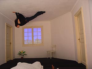 Verkehrtheroom - Videoinstallation von Friederike RückertIn den ersten Tagen des Februars wurden Passanten in der Hansastraße/Ecke Gutenbergstraße nach Einbruch der Dunkelheit durch ungewöhnliche Bilder zum Einhalten und genauem Hinschauen bewegt. Hinter einem großen Schaufenster schien der Blick frei zu sein auf ein fast leeres, weiß gestrichenes Zimmer, darin ein Stuhl und eine Pflanze. Zwei Türen und ein Fenster mit Blick auf blauen Wolkenhimmel deuten eine Welt außerhalb an. Der Raum scheint jedoch keinen physikalischen Gesetzmäßigkeiten zu unterliegen. Eine junge Frau hängt unter der Decke, versucht zunächst vergeblich auf den Boden zurückzukehren. Als ihr das nicht gelingt, beginnt sie, den Raum spielend zu erkunden. Sie kann jedoch nie die hermetische Welt des Zimmers verlassen.![]() ![]() ![]() |