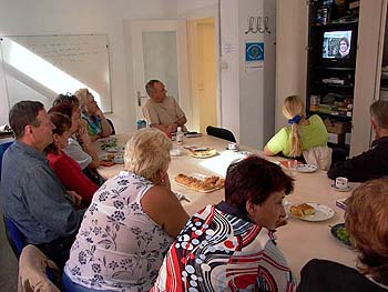 Kurzfilmpremiere bei Kaffee und PiroggenSchwungvolles Mitsingen und selbstkritisches Stirnrunzeln begleiteten das Hörspiel, doch am Ende stand reichlich Applaus. Auch mit dem Video waren alle zufrieden und fanden sich thematisch oder persönlich im Film wieder. So kann das Projekt vielleicht dazu dienen, zukünftigen Teilnehmern Skepsis und Kamerascheu zu nehmen, denn ob auf Video oder im Alltag: das Leben in Deutschland geht weiter. (