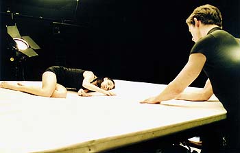 Schattenspiel der AntastbarkeitGerald Grote und Claus Oppermann drehten den berührenden Kurzfilm Blindschatten mit minimalen Mitteln.Tastende Hände, langsame Annäherung, schließlich die Umarmung, das Verschmelzen der Körper. Ein anrührender Pas de deux des menschlichen Kontakts, der Liebe flackert da über die Bildschirme des Schnittplatzes in der Filmwerkstatt der Kulturellen Filmförderung Schleswig-Holstein hoch unter dem Dach der Kieler Pumpe. Gerald Grote (rechts) und Claus Oppermann beim Schnitt in der Filmwerkstatt (Foto: jm)Das wird der erotischste Film des Jahres, sagt Gerald Grote, Kieler Autor, Multitalent und Filmregisseur seit seinem Debüt Tödliche Roman(z)e, einer Literaturverfilmung von 40 Romanen in neun Minuten, die bisher 32 Festivalteilnahmen mit siebenfacher Preiskrönung und ein Prädikat besonders wertvoll der Filmbewertungsstelle auf ihrem Erfolgskonto verbuchen kann. Auf solchen Lorbeeren, auch denen obigen selbst gewährten Vorschusses, ruht sich Grote indes nicht aus. Blindschatten heißt sein gemeinsam mit Kameramann, Cutter, Co-Produzent und Co-Regisseur Claus Oppermann und einem 13-köpfigen Team in nur einem Drehtag realisiertes neuestes Projekt. Anlass: der Wettbewerb Blind Spot des Hamburger Vereins Dialog im Dunkeln, Thema: Wie sieht ein Blinder die Welt?Liebe macht blind, fiel dem Wortspieler Grote dazu sofort ein, nebst der Idee, die Kontaktaufnahme zweier Menschen - sie lernen sich wie Blinde nur durch Berührung kennen - als Schattenspiel zu inszenieren, nicht auf der Leinwand, sondern dahinter. Grotes Drehbuch passt auf eine DIN-A4-Seite: Ihre Hände flüstern, beide fühlen sich ergriffen, schon das liest sich wie ein zärtliches Poem. Nicht anders die filmische Umsetzung: Ein halbtransparentes Tuch auf ein Gestell gespannt, darauf zur Musik von Chris Evans Ironside der sanfte Tanz der Körper von Tina Slabon und Stefan Späti, Ensemblemitglieder des Kieler Balletts, gefilmt von unten durch die Leinwand als auf einander zu Wogen der Schatten. Tina Slabon und Stefan Späti beim Dreh ... ... und im Gegenlicht (Fotos: Helmut Neumann)Grote wäre nicht Grote, wenn er diesen schon im Rohschnitt als außergewöhnliches Filmkunstwerk erkennbaren Vier-Minüter nicht auch noch als No Budget mit nur 14 Tagen Vorbereitung produziert hätte. Ballettchef Mario Schröder und seine Eleven waren ebenso wie die Berliner Firma trickWilk, die den digital gedrehten Film zum Selbstkostenpreis auf 35 mm belichten wird, sofort von dem Projekt begeistert. Ganz zu schweigen vom Team, das nicht nur seine Arbeitskraft spendete, sondern beim Dreh in nur acht Takes kurz vor Weihnachten in der Pumpe auch spontanen Szenenapplaus.Enstanden ist der wohl emotionalste Kurzfilm des ausgehenden Jahres. Man glaubt nur etwas zu sehen, sagt Grote, der mit seinen minimalistischen Bildern die Fantasie für den einfachsten Vorgang der Welt, die Emotionen zweier Menschen, anregen will. Die weckt er bei allen Beteiligten nicht zuletzt durch die berückende Kraft seiner Idee, dass Sehen nicht das Wichtigste im Film ist, sondern Fühlen. Und das ist im buchstäblichen Sinne berührend. (jm)zurück zum Inhalt |