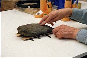 Der Schlitten der Steinzeit - Transport eines Megalithen erfindet Paulsen am Schreibtisch nach, wie man einen schweren Körper mit Rollen transportieren kann, dass es nicht genügt, den Megalithen selbst auf Rollen zu legen, sondern dass man dafür Bohlen braucht, auf denen der Stein ruht. Mit präzisem Blick zeigt die Kamera Paulsens Hände beim Hantieren mit einem Lineal (Bohle) und Bleistiften als Rollen.