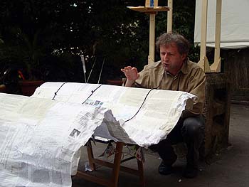 Symbolische Schwere und luzide Leichtigkeit mit ostentativ doppeltem Boden bestimmen das Festival gleich zu Beginn. Nebst der Frage, ob man das dokumentieren, konservieren kann – oder soll? Der geht Johannes Lothar Schröder in seiner „relic lounge“ nach. Die Objekte, mit denen er wie mit Engelsflügeln, die doch der springflutenden Schwerkraft gehorchen müssen, flattert und klappert, wie es zum Kunstgeschäft gehört, sind aus Papier. Das ist bekanntlich geduldig und enthält hier Relikte der Reflektion über Performance, Artikel (auch dieser Zeitungsartikel ließe sich darin eingemeinden), Skizzen, Beschreibungen von gewesenen Performances, die jetzt aus diesem „lebendigen Archiv“ wiedererweckt werden. „Transformation der Objekte in einen neuen Raum und eine neue Zeit“, so nennen das Ingrid L. Ernst und auch Annette Grass, Vertreterin des Hauptsponsors Staatskanzlei, Abteilung Kultur, in ihren Grußworten sinngemäß einhellig.