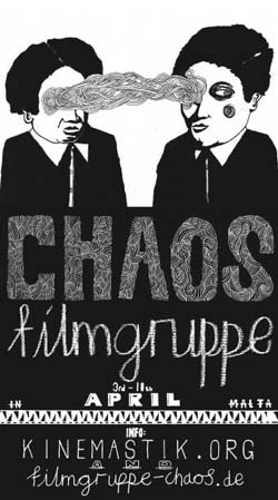 Örtliches Plakat zur Ankündigung der Filmgruppe Chaos auf Malta (Fotos: Karsten Weber)Man weigerte sich den wertlosen Euro anzunehmen, denn man zahlt dort mit der Maltesischen Lira, die man einfach „Pound“ nennt und hat den Linksverkehr der ehemaligen Kolonialherren beibehalten. Gesprochen wird ein babylonisches Arabisch, das mit Italienisch, Englisch und Brocken anderer Sprachen durchsetzt ist und mit lateinischen Buchstaben geschrieben wird. Um der freundlichen und entspannten Lebensart ein Gegengewicht zu geben, organisieren sich die Malteser gern in dem mächtigen Jägerverband um auf alles zu ballern, was auf der Insel herumflattert, egal ob Spatz, Nachtigal oder Flamingo. Unter der Enge des Insellebens und der Hitze der südlichen Sonne gediehen unglaubliche Blüten des katholischen Glaubens, man will dort in Punkto religiösen Fanatismus den Indern keinesfalls nachstehen. Jedes Haus trägt einen katholischen Namen, die Wohnung unseres Gastgebers lag in der „Straße der Unbefleckten Empfängnis“, Krankenhaus, Uni und auch die Produktionshallen der Industrie werden von Glühbirnenkreuzen geziert und Schutzheilige überwachen jede Kreuzung und fehlen in kaum einer Wohnung, PKW oder Reisebus. Selbst heutzutage errichtet man in diesem Land noch Kathedralen. Man betrachtete uns wohl als Vertreter von Gegenkultur als man bei unserem ersten Kurzfilmprogramm