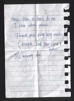„Es gibt so grossen Unterschied zwischen deutschen und chinesischen Filmen, und die Probleme, für die wir sich interessieren, sind auch verschieden. Ihre Filme haben unseren Augenblick erweitert und uns eines frisches Gefühl gegeben!“
