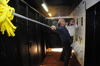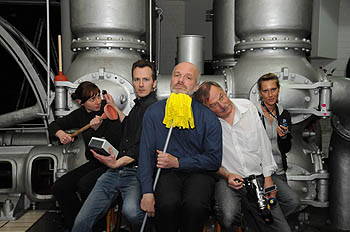 „Herren“ – „Take One“-Film von Oliver BoczekNach einer Idee von Melanie Riebe realisierte Oliver Boczek seinen zweiten „Take One“-Film „Herren“, den zweiten Teil einer Trilogie, die sich mit technischen Alltagsproblemen auseinandersetzt. Auch in diesem dreiminütigen Film muss der Protagonist, wie bereits im ersten Teil „RadioAktivität“, wieder mit viel Geduld und Körberbewegung an sein Ziel gelangen, wird aber am Ende doch von der Technik vorgeführt. Unerwartet kommt es in dieser Geschichte auf einem Herren-WC zu einer Auseinandersetzung zwischen einem Bewegungsmelder und einem am Ende völlig genervten Mann. ![]() Martin Friederichs in Auseinandersetzung mit einem Bewegungsmelder (Fotos: Andrea Segelbach)Für diesen in einer Einstellung gedrehten Film, konnte wieder Martin Friederichs gewonnen werden. Mittlerweile ist es die dritte Zusammenarbeit zwischen Friederichs und dem Regisseur Oliver Boczek. ![]() Kameramann Bernd Fiedler und Martin FriederichsDa der Drehort ein kleines Herren-WC im Kieler Kulturzentrum „die Pumpe e. V.“ war, musste das Team möglichst klein gehalten werden. Bernd Fiedler war bei dieser Produktion als Bildgestalter verantwortlich und konnte dabei auch sein Talent als Elektriker unter Beweis stellen. Die Regieassistenzen übernahmen Birthe Langfeldt und Franziska Rudolph. Wie bereits bei „Radio Aktivität“ galt es auch hier, folgende Prämisse einzuhalten: Die Geschichte sollte in einer einzigen Einstellung, ohne Bildschnitt und Überblendungen, gedreht werden. Lediglich auf der Ton-Ebene durfte eine Bearbeitung stattfinden. Das war auch nötig, da der Originalton vollständig ausgetauscht und durch separat aufgenommene Töne und Geräusche ersetzt werden musste. Diese mühevolle Aufgabe wurde von Franziska Rudolph perfekt umgesetzt. So perfekt, dass „Herren“ beim diesjährigen Videowettbewerb „Tiefenschärfe 2008“ der Offenen Kanäle Kiel und Flensburg in der Kategorie „Take One“ Jury-Sieger wurde. ![]() Das „Herren“-Team: (v. l. n. r.) Franziska Rudolph, Oliver Boczek, Martin Friederichs, Bernd Fiedler und Birthe Langfeldt„Herren“ (D 2008, 3 Min.), Skript, Produktion, Regie: Oliver Boczek, Idee: Melanie Riebe, Bildgestaltung: Bernd Fiedler, Regieassistenz: Birthe Langfeldt, Franziska Rudolph, Musik: Christopher Evans Ironside, Sounddesign: Franziska Rudolph (nach einer Produktionsnotiz) |