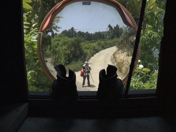 „Pilgern ist kein Händchen Halten mit Gott“Gerald Koll über seinen Film „88 – pilgern auf japanisch“Du konntest die Sprache nicht verstehen und die Wegweiser nicht lesen, was du in deinem Film humorvoll kolportierst. Wie kommuniziert man mit Menschen in solcher Fremde? Wenn man nichts versteht, entsteht eine andere, sehr schöne Kommunikation: das gegenseitige Einverständnis, sich in der peinlichen Lage zu befinden, miteinander nicht sprechen zu können – und darüber gemeinsam zu lachen. Das sind sehr intime Gespräche mit dem Fremden, die ich sehr genossen habe. Fremd, aber nicht allein: Gerald Koll vor einem der 88 Tempel (Fotos: Koll)Ist das auch eine Folge der Entrückung, die man beim Pilgern erreicht?Ich würde nicht von „Entrückung†sprechen wollen. Pilgern heißt – jenseits religiöser Mystik –, sich auf einen guten Weg zu begeben. Pilgern verändert die Wahrnehmung, man entschlackt, man wird körperlich und geistig leichter und sozusagen befreiter. Im Film gibt es eine Szene, wo ich mit einer Raupe tanze, eine Lächerlichkeit, die ich mir normalerweise nicht erlauben würde. Indem man sich aber mit der fremden Welt immer wieder neu verbindet, entsteht eine Leichtigkeit, die so etwas zulässt. Ist das jener Zustand „glücklicher Leereâ€, den die japanischen Pilger „henro boke†nennen? Du hattest ja auch noch eine Kamera dabei. War die auch mit solcher Leichtigkeit zu bedienen? Die japanischen Pilger nennen das gar nicht so. Den ganzen Film rätsele ich mit Pilgern über diesem Begriff, den ich in der Literatur gefunden hatte. Ich weiß auch nicht, ob „glückliche Leere†eine zu romantische Vorstellung vom Pilgern weckt. Pilgern ist kein Händchen Halten mit Gott oder Buddha, es ist Arbeit: Blasen an den Füßen, Schwitzen, Aufpassen, dass man den Weg nicht verliert. Man kann sich auf so einer Pilgerfahrt gar nicht erlauben, in meditative Leere zu fallen. Deshalb haben die japanischen Pilgerstäbe auch Glöckchen, die den Pilger immer wieder aufwecken. Und ich hatte mit der Kamera eine zwei Kilo schwere Kuhglocke um den Hals hängen, ... ... die dich immer wieder ins „Wahre†zurückgeholt hat? Und die ich wiederum ins Reale zerrte, damit sie sich nicht im Klischee verliert. Wie ich das filmte, war nicht nur eine ästhetische, auch eine ethische Frage. Sie lautet: lässt sich Pilgern in Bilder übersetzen, die sich nicht in Tempeln und Räucherstäbchen erschöpfen, sondern das Neue wagen. ![]() Im Spiegel von „Miss Sony“Also als Apparat authentischen Abbildens? – Man hat in deinem Film den Eindruck, dass die Pilger, dich eingeschlossen, die Kamera gar nicht bemerkten und ganz ungezwungen vor ihr agierten.Meine Kamera – ich nenne sie: Miss Sony – und ich versuchten, uns so klein wie möglich zu machen. Deshalb ging ich allein. Ich wollte den Abstand zu den Anderen, die so eine Apparatur naturgemäß mit sich bringt, so gering wie möglich halten. Kameras schaffen Dominanz und Angst. Ich aber wirkte oft hilflos und war es ja auch. Für den Kontakt zu Japanern, denen eine gewisse Scheu eigen ist, ist das sehr förderlich. So begegneten wir uns auf Augenhöhe, statt im Ritual zu versteifen. Dazu gehört auch, dass ich selbst sichtbar werde: Das Publikum kann sehen, wer da filmt und unter welchen Bedingungen er sieht. Wer sich auf einem Weg befindet, sollte seinen Standpunkt kennen. Und ihn auch benennen. (Interview: jm) Kiel-Premiere in Anwesenheit des Filmemachers am Freitag, 12.12., 20.30 Uhr im KoKi. Weitere Aufführungen am 13., 14., 16., 17., 20., 21. und 23.12., jeweils 18.30 Uhr. Infos über den Film unter www.88-pilgern-auf-japanisch.de. |