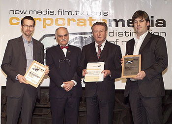3 x Gold - Forward Filmproduktion für innovative Internetseite ausgezeichnet Insgesamt 4 Auszeichnungen erhielt Deutschlands nördlichste Filmproduktion Forward (Flensburg) für ihre wegweisende Internetseite www.forward.sh, in der Film und Internetseite zu einer Einheit werden. Gleich 3 Preise in Gold wurden im Dezember in Dortmund auf dem 20. Meister-Wettbewerb der Corporate Media an Forward verliehen. Die Masterauszeichnung "Member of the European Masterclass" zählt zur höchsten Anerkennung der Medien- und Kommunikationsbranche. Teilnehmer an dem Wettbewerb waren u.a. Unternehmen wie Porsche AG, Bayer AG, Allianz, Microsoft, BMW, Siemens, Salzgitter, Jungheinrich, Ray Sono, Axel Springer und DaimlerChrysler AG. ![]() Preisverleihung 20. Meister-Wettbewerb der Corporate Media - Außen rechts: Sönke Lassen (Forward Filmproduktion), Mitte rechts: Rolf G. Lehmann Jury- und Organisationsleitung Corporate Media, Mitte links: Manfred Ernst (Geschäftsführer Bundesverband Deutscher Film- und AV Produzenten e.V.), Außen links: Mario Kuntzmann (Forward Filmproduktion) Im Rahmen des Wettbewerbs erhielten die Flensburger zwei Mal die höchste Auszeichnung MASTER OF EXCELLENCE für das Medien- und eContent-gestützte Kommunikationskonzept sowie für die eigentliche Umsetzung der Internetseite www.forward.sh. Zusätzlich wurde der Sonderpreis für die BESTE INTERNETLÖSUNG 2008 vergeben. Bereits im September erhielt die Filmproduktion auf dem 16. ITVA-Festival im Rahmen der Photokina in Köln den ITVA-AWARD SILBER in der Kategorie Multimedia-Anwendungen. ![]() Screenshot der Website www.forward.sh Forward Filmproduktion erstellt seit 1996 Filme für die Bereiche Image, Werbung & Web. Die Zukunft des Internets und die Möglichkeit, Film und das Web sinnvoll miteinander zu verbinden, führte zu dem neuartigen Konzept. Das Medium Film wird hier zum tragenden Element der Internetseite, um die Inhalte im Netz zukunftsweisend zu präsentieren: dynamisch, lebendig und emotional - eben filmisch. Keine Texte, die gelesen werden müssen, keine statischen Bilder. Alles ist bewegt, alles wird erzählt und moderiert. Die Internetseite wird zum Erlebnis in einer neuen Qualität. Weitere Informationen unter: www.forward.sh (nach einer Pressemitteilung von Forward Film, Flensburg) |