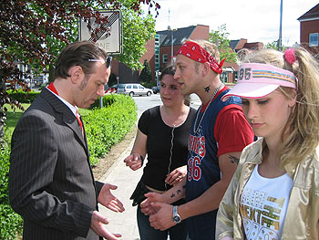 „Carpe Diem“ – Kurzfilmdreh in SchönbergDie Filmemacherin Sabrina Bahr inszenierte ihr erstes Projekt nach eigenem Drehbuch. Die Geschichte dreht sich um einen jungen Mann, dessen Leben durch eine Reihe unglücklicher Zufälle in eine völlig neue Richtung gelenkt wird. Dabei liegen Auf- und Abstieg ganz dicht beieinander – und buchstäblich auf der Straße. ![]() Der Yuppie Bob (Tom Keller, rechts) in den Armen eines Obdachlosen (Oliver Berthel) (Fotos: Oliver Boczek)Der Kieler Theaterschauspieler Tom Keller konnte für die Hauptrolle engagiert werden. Neben Keller, der zuletzt in „WoyzEck_VoiceOver“ unter der Regie von Jens Raschke der Theatergruppe DeichArt zu sehen war, spielte Oliver Berthel die zweite Hauptrolle. Berthel war bereits in der Vergangenheit in einigen Kieler Kurzfilmen zu sehen. Nach zahlreichen Film- und Regieseminaren und verschiedenen Tätigkeiten bei anderen Kurzfilmprojekten geht die autodidaktische Filmemacherin Bahr nun ihren eigenen Weg und inszenierte nach eigener Vorlage. Dabei konnte sie auf ein erfahrenes Filmteam zugreifen. Für die bildliche Umsetzung zeichnete der bekannte Kieler Kameramann Torben Sachert verantwortlich, der bereits in der Vergangenheit die Bilder für zahlreiche Kurzfilme geliefert hat. Unterstützung fand die Filmemacherin Bahr in der erfahrenen Regieassistentin Alexandra Eck, die zur Zeit das Green Screen Naturfilmfestival Eckernförde mit dem Festivalleiter Gerald Grote organisiert. Die Produktionsleitung hatte der Kieler Filmemacher Oliver Boczek („Schlüsselerlebnis“) übernommen. ![]() Tom Keller, Rüdiger Petersen und Hannah Koschine im Gespräch mit der Regisseurin Sabrina Bahr (Mitte)Das von der Filmförderung Hamburg Schleswig-Holstein geförderte No-Budget Projekt mit dem Arbeitstitel „Carpe Diem“ wurde komplett in der Perserau Straße in Schönberg gedreht. Dazu war es nötig, die Perserau an den drei Drehtagen komplett zu sperren. Die Gemeinde Schönberg war sehr entgegenkommend und gab sofort ihre Zustimmung. Auch die Bevölkerung zeigte Verständnis für die ausgeschilderte Umleitung. Nach einem gelungenen Dreh befindet sich das Rohmaterial nun in der Postproduktion. Die Regisseurin Sabrina Bahr und ihr Cutter Torben Sachert müssen nun entscheiden, welche Bilder sie für den endgültigen Schnitt auswählen wollen. Voraussichtliche Premiere ist dann im September. (nach einer Pressemitteilung) |