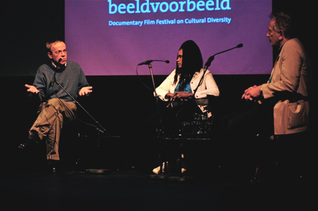 Nach erfolgreicher Aufnahme in Amsterdam geht „Du bist mein Afrika“ nun nach BogotaHelmut Schulzecks Dokumentarfilm „Du bist mein Afrika“ wurde am 3. Juni 2010 auf dem sozio-ethnologischen Dokumentarfilmfestival „Beeld voor Beeld“ im Tropentheater Amsterdam gezeigt. Zusammen mit Maria Webers „Nairobi Love Story“, die die Liebesgeschichte einer Kikuyu-Frau zu einem Luo-Mann, erzählt, bildete der Film quasi einem kleinen Kenia-Schwerpunkt innerhalb des Festivals. Der Film fand in dem mit ca. 160 Zuschauern gut gefüllten Festivalkino eine sehr gute und lebhafte Aufnahme, die sich dann auch in der anschließenden, rund halbstündigen Diskussion von Helmut und Wangechi Schulzeck mit dem Moderator und Publikum niederschlug. ![]() Helmut und Wangechi Schulzeck in der Diskussion nach der Filmaufführung (Foto: Marjolein Berghuis)Einen Hauptschwerpunkt des Festivals stellten sieben Dokumentarfilme aus und über Südafrika dar. Einen kleinen Einblick über das Festival findet sich auch auf der YouTube-Chanel von „Beeld voor Beeld“, auf dem zu vielen Dokumentarfilmen nicht nur aus diesem Jahr Filmausschnitte eingestellt sind. „Beeld voor Beeld“ wird im Oktober regelmäßig auch noch in Kolumbiens Hauptstadt Bogota präsentiert. Dafür wird u. a. eine spanisch untertitelte Fassung von „Du bist mein Afrika“ vom Festival erstellt. (hsch) |