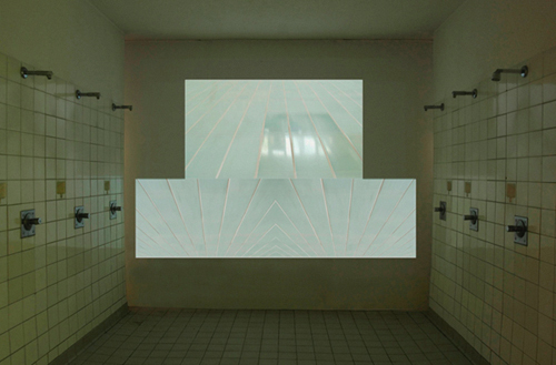 Crossing the line – Janne Höltermanns Videoinstallation „kacheln†im Lessingbad KielUnser Raumempfinden als Stadtmensch ist so rechtwinklig wie die Linien und Ecken der Architektur, in der wir leben. Unsere Bewegungen werden geregelt und begrenzt durch sichtbare Linien auf dem Boden und unsichtbare Linien in unseren Köpfen. Wir akzeptieren jedes Gartentürchen als Grenze zwischen Drinnen und Draußen, zwischen Dein und Mein. Wir schreiten über Zebrastreifen und treten in gelb markierte Felder, bevor wir eine Zigarette anzünden. Diese Linien, ob konkret oder imaginär, sind die Ariadnefäden, aus denen wir uns ein Sicherheitsnetz der Orientierung knüpfen. Wie fragil dieses Netz ist, hat Janne Höltermann bereits in ihrer Fotoserie „lots†(2009) klar gemacht, indem sie die perspektivisch verzerrten Markierungen auf Parkplätzen und Fußgängerwegen nachträglich begradigte und damit eine kubistisch verwirrende Gleichzeitigkeit von An- und Aufsichten erzeugte. Das strenge Raster der Fliesen im Lessingbad erinnert daher nicht zufällig an das Orientierung gebende Netz von Längen- und Breitengraden auf einer Weltkarte, deren Ozeanflächen sogar das gleiche Türkisblau zeigen wie die Bodenfliesen des Schwimmbeckens. Die rasenden Bilder, die wir sehen, sind aber kein „Point of viewâ€, keine subjektive Kamera, die eine menschliche Wahrnehmung simuliert wie bei Verfolgungsjagden im Hollywoodkino. Sie zeigen den maschinenhaften Blick eines Sensors, der emotionslos die Umgebung scannt und vertraute Zeichen und Orientierungspunkte zu grafischen Mustern reduziert, bis ins dekorativ Ornamenthafte. Die Kamera überquert dabei ungerührt die Markierungslinien, die einst den chlorgetrübten Augen der Schwimmer die Richtung weisen sollten, und im Zusammenspiel aus drei synchronisierten Bildkanälen entstehen Kaleidoskop-Effekte, die endgültig die Dimensionen des Raumes durcheinander wirbeln. Die gefällige Ästhetik, die diesen Bildern innewohnt, wird durch eine penetrante Tonspur gebrochen, die Hinweise auf den Schaffensprozess gibt. Das Rattern der Installation dringt lautstark durch die ganze „Damenseite†der Badeanstalt und verrät, dass die Kamera keineswegs schwebt oder schwimmt, sondern sehr bodenständig und erdverbunden mit einem Rollwagen über die Fliesen kachelt. ![]() „kacheln†in der Damendusche: Janne Höltermanns Beitrag zur Ausstellung „Körpersichten†im Kieler Lessingbad (Fotos: Janne Höltermann)Die Kamera ist die eigentliche Protagonistin in Janne Höltermanns durchweg menschenleeren Videos. Am Ende jeder Bahn schlägt das Gerät einen Purzelbaum und stellt die Welt auf den Kopf. Der Apparat wird selbst zum „spinning object†wie in ihrer gleichnamigen Serie von Kurz-Clips, in denen sich Kreisel, Flaschen und Münzen gegen die Regeln von Zeit und Raum auflehnen. Das Element der Drehung als Quelle schwindelerregender Verwirrung findet sich mehrfach in Janne Höltermanns Videoarbeiten. In „spin†(2010) wird eine gläserne Drehtür zum Rührwerk, das gemächlich den Innenraum nach draußen schaufelt und zurück. In „bulbs†(2007) kreist eine Glühbirne im Licht eines Beamers unablässig über einem Ventilator und wirft mehr Schattenbilder, als ihr zustehen. Auch in der Videoserie „gyms†(2008), an die die „kachelnâ€-Arbeit direkt anknüpft, rumpelt die Kamera über leere Aschenbahnen und Turnhallenböden bis zum finalen Überschlag. Mit solchen Bildern zieht Janne Höltermann uns den Boden unter den Füßen weg und zerreißt die Netze, die uns auffangen könnten. Wir sollten also besser nicht vom Beckenrand springen. (Lorenz Müller) Die genannten Arbeiten sind dokumentiert auf Janne Höltermann (geb.1977) studierte in Madrid und an der Muthesius Kunsthochschule in Kiel, erhielt 2005 den Muthesiuspreis der NordWestLotto GmbH und war Stipendiatin am Massachusetts College of Art and Design in Boston. Zur Zeit hat sie für zwei Jahre einen Lehrauftrag für digital arts an der Wesleyan University in Middletown, Connecticut. Mit Ihrer aktuellen Installation „kacheln†nahm sie an der Ausstellung „Körpersichten†der Muthesisus Kunsthochschule im Kieler Lessingbad teil (1. bis 24. Juni 2011). Die Arbeit entstand mit technischer Unterstützung der Filmwerkstatt Kiel der Filmförderung Hamburg Schleswig-Holstein. |