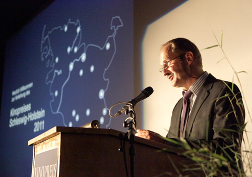Kinopreis Schleswig-Holstein 2011 – Eindrücke von der Preisverleihung am 28. Juni im Flensburger Kino „51 Stufenâ€Die Kamera schwebt über das weite Blau einer virtuellen Landkarte. Sinfonische Orchesterklänge begleiten den kurvenreichen Flug, während aus dem Boden im Takt der Musik stilisierte Fahnenmasten sprießen. „Großes Kino!†möchte man denken, wenn man den stimmungsvollen Trailer des Mediengestalters Stephan Lübke sieht. Doch beim Kinopreis Schleswig-Holstein geht es nicht um die großen Popcorn-Paläste mit ihren millionenschweren Blockbustern, sondern um Programmkinos, die sich die Liebe zum Film auf ihre Fahne geschrieben haben und mit viel Engagement Flagge zeigen gegen die kulturelle Monotonie im Land. Dass diese kleinen Kinos ein wichtiges Element in der Nahrungskette der Filmkultur sind, hat nun auch die Landesregierung Schleswig-Holstein reuevoll eingesehen und den Preis nach seiner Wiederbelebung 2009 und seiner überraschenden Aussetzung 2010 erneut ins Leben gerufen. Insgesamt 27.500 Euro Preisgelder wurden an 14 Gewinner-Kinos verteilt. Ausschreibung und Abwicklung der Preisvergabe erfolgten in Zusammenarbeit mit der Filmwerkstatt Kiel der Filmförderung Hamburg Schleswig-Holstein. Eckhard Zirkmann, Staatssekretär des preisstiftenden Kultusministeriums, war nach Flensburg ins Kino „51 Stufen†gereist, um persönlich Urkunden, Blumen, Glückwünsche und natürlich Schecks zu verteilen. ![]() Verteilte das Preisgeld mit vollen Händen und großer Geste: Kulturstaatsminister Eckhard Zirkmann. (Fotos: Lorenz Müller)Preiswürdige Auswahlkriterien waren die Gesamtqualität eines Jahresprogramms, besondere Angebote für Kinder und Jugendliche, Engagement für den Dokumentarfilm aber auch Ideen zum innovativen Marketing sowie besondere Serviceleistungen und Ausstattung der Spielstätten. Die dreiköpfige Auswahljury bestand aus der Kulturredakteurin Ruth Bender von den „Kieler Nachrichten“, dem Drehbuch- und Hörspielautor Arne Sommer aus Neumünster, der auch Vorsitzender der Kulturellen Filmförderung Schleswig-Holstein e.V. ist , sowie Ruth Rogée vom Scala-Kino in Lüneburg als Vertreterin der Kinopreisgewinner 2009. ![]() v.l. : Moderator Udo Biss mit der Jury: Ruth Bender („Kieler Nachrichten“) und Arne Sommer (Vorsitzender Kulturelle Filmförderung SH e.V.). Nicht im Bild: Ruth Rogée vom Scala Kino Lüneburg.Die drei hatten harte Nüsse zu knacken und mussten sich durch dicke Stapel umfangreich dokumentierter Bewerbungen arbeiten. Das weitgefasste Profil des Preises machte es nicht einfacher, denn die Grenzen zwischen Kultur-Event und Event-Kultur sind oftmals unscharf, und nicht jedes Dorfkino, das eine „Sex-and-the-Cityâ€-Premiere mit Gratis-Prosecco und Men-Strippern bereichert, durfte auf eine Ehrung hoffen. So konnte sich Juror Arne Sommer trotz allgemeiner Feststimmung auch den mahnenden Fingerzeig nicht verkneifen, den kulturellen Qualitätsanspruch doch bitte nicht aus den Augen zu verlieren. Moderiert wurde die feierliche Veranstaltung von NDR-Redakteur Udo Biss, der seinem Namen alle Ehre machte, und mit eloquentem Charme und schelmischem Blick über die Halbbrille Publikum und Gäste souverän durch den Abend begleitete. Nachdem er sich eigenfüßig von der namengebenden Stufenzahl des Flensburger Kinos überzeugt hatte („51! Stimmt!â€) dirigierte er in flüssiger Choreographie die Preisträger über die Bühne, entlockte dem Staatssekretär ein paar Kinoanekdoten und streute wohldosiert Hitchcock-Zitate ein: „Die Länge eines Films sollte im gesunden Verhältnis zum Fassungsvermögen der menschlichen Blase stehen.†![]() Moderation mit Charme und Biss: NDR Redakteur Udo Biss führte durch den Abend.Unterstützt von einem punktgenau abgestimmten Media-Design, das die Zuschauer stets über Namen und Preise auf dem Laufenden hielt und abgerundet durch ein üppiges Buffet wurde die Veranstaltung, die leicht ein trockenes Geldverteilungsritual hätte werden können, zu einem stimmungsvollen und kurzweiligen Festakt, der dem Kino als Stätte von Kultur und Unterhaltung gerecht wurde. (Lorenz Müller) Die Preise und ihre Gewinner: