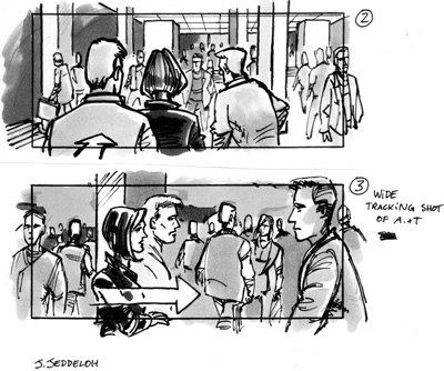 Comic-Kick für den FilmDer Sommertreff der schleswig-holsteinischen Filmbranche widmete sich dem Storyboard„Storyboard“ – man hat das irgendwie schon mal gehört, aber was es genau bedeutet, fern von Hollywood und gerade auch für das eigene Filmvorhaben, wussten die wenigsten Gäste beim Sommertreff der schleswig-holsteinischen Filmbranche am 28.8.2014 in der Landesbibliothek S.-H., veranstaltet von der Filmwerkstatt Kiel und der Kulturellen Filmförderung S.-H. e.V. in Zusammenarbeit mit dem im Mai neu gegründeten Comic Center Kiel. ![]() Arne Sommer (l.), Leiter der Filmwerkstatt Kiel der FFHSH, begrüßt das Publikum in der schleswig-holsteinischen Landesbibliothek und stellt die Vortragsgäste zum Thema „Storyboard†vor: Jens Jeddeloh (r.) und Volker Sponholz (m.) (Foto: Lorenz Müller)Volker Sponholz (Comic-Zeichner (u.a. „Bertis Buben“), Comic Center Kiel, Mitherausgeber der Comic-Zeitschrift „Pure Fruit“) und der Berliner Comic-Zeichner und in mehreren Produktionen erfahrene Storyboard-Artist Jens Jeddeloh zeigten in einem instruktiven Vortrag, wie Story-Boarding dem Film einen echten Comic-Kick geben kann. Storyboards, die skizzenhafte Vorzeichnung von Filmbildern und -sequenzen, führte einst Walt Disney für seine Trickfilme ein – um Kosten zu sparen: Ganze Filme wurden zunächst in repräsentativen Einzelbildern skizziert auf den Soundtrack gelegt, um hinterher nur die Szenen wirklich zu animieren, die auch gebraucht wurden. Story-Boarding für Real-Filme ist zwar zunächst ein zusätzlicher Kostenfaktor in der Projektentwicklung, indem es aber das Drehbuch vorab detailliert visualisiert – in enger Zusammenarbeit des Zeichners mit Regisseur und meist auch Kameramann – kann es die Produktionskosten am Set erheblich reduzieren. ![]() Warfen sich im lockeren Dialog die Bälle zu: Der Kieler Zeichner und Illustrator Volker Sponholz (l.), und der Berliner Zeichner Jens Jeddeloh, der unter anderem für die Comic-Verfilmung „Aeon Flux“ das Story-Board zeichnete (Foto: Lorenz Müller)Jens Jeddeloh berichtete von seinen Erfahrungen bei Produktionen wie der Comic-Verfilmung „Aeon Flux“ (USA/D 2005, Regie: Karyn Kusama). Dort war zwar schon viel vorgegeben, seine szenischen Zeichnungen zur „Visualisierung in der Vorstufe“ etwa einer Verfolgungsszene in einer U-Bahn anhand eines Set-Modells wurden dennoch fast 1 zu 1 umgesetzt. Mit diesem Beispiel und dem einer Probearbeit zu einer Revisualisierung einer Szene aus „Batman“ erläuterte Jeddeloh auch die eigene Zeichensprache eines Storyboards (Pfeildiagramme für Bewegungen der Kamera und Darsteller sowie Zooms). ![]() Ausschnitt des Storyboards von „Aeon Fluxâ€, für das der Storyboard-Artist Jens Jeddeloh ein plastisches Architekturmodell zur Verfügung hatte, um die Bewegung von Kamera und Protagonisten zu visualisieren (Foto: Jens Jeddeloh)Bei einem bestehenden und bereits produktionsfertigen Drehbuch können die Skizzen durchaus fragmentarisch sein (wie etwa in Martin Scorseses zwar laienhaft gezeichnetem, aber die Szenen und deren Ablauf genau skizzierenden Storyboard zu „Taxi Driver“), „Hauptsache, der Kameramann kann sie lesen“, so Jeddeloh. Aber auch in der Projektentwicklung und zur Akquise können Storyboards nützlich sein. Dafür sind in der Regel genauer ausgefertigte, fast schon einem „Comic vor dem Film“ ähnliche Zeichnungen nötig. Die Arbeit des Zeichners kann dabei so weit gehen, dass er Interieurs entwickelt, die später Filmarchitekten als Vorlage dienen – wie in Jeddelohs Storyboard zur Science-Fiction-Serie „Lexx – The Dark Zoneâ€, wo eine „Alien-Kantine“ nach seinen zeichnerischen Entwürfen designt wurde. In solchen Fällen wird der Storyboard-Artist beinahe schon zum Co-Autor. Sogar für den Schnitt kann das Storyboard eine wichtige Hilfe sein. ![]() Je mehr Action, desto mehr Bilder – im Unterschied zum schriftlichen Drehbuch, ist der Umfang eines Storyboards abhängig von den Bewegung im Bild (Foto: Jens Jeddeloh)Überdies zeigen Storyboards, wie nah sich die Dramaturgien von Comic und Spielfilmen sind, wie sie sich gegenseitig ergänzen können – auch filmische Erzähltechniken lassen sich vice versa für den klassischen Comic nutzen – und wie der Comic dem Film so einen Kick geben kann. Volker Sponholz und das im Comic Center Kiel vereinte Zeichnerkollektiv können daher zurecht auf eine in Zukunft engere Zusammenarbeit mit schleswig-holsteinischen Filmemachern hoffen. Wie gesagt: eine Win-Win-Situation für beide Künste – und vielleicht auch Ausblick auf zukünftige Crossmedia-Projekte. (jm) |