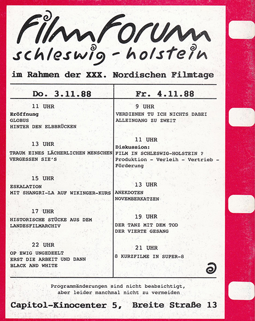 59. Nordische Filmtage Lübeck 2017„Zu sehen, was es gibt, und zu besprechen, was es braucht†– 30 Jahre Filmforum Schleswig-Holstein / FilmforumEs begann ganz bescheiden 1988 mit einem Filmforum Schleswig-Holstein, das noch nicht „richtig†zum offiziellen Programm der Nordischen Filmtage Lübeck gehörte, aber immerhin fand man die Formulierung „Filmforum Schleswig-Holstein im Rahmen der Nordischen Filmtage Lübeckâ€, unter der das Filmforum die ersten Jahre firmierte, veranstaltet vom Zentrum (in der Mengstraße) bzw. dem Jugendamt der Hansestadt Lübeck. ![]() ![]() Umschlagseiten des "Kataloges" zum 1. Filmforum Schleswig-Holstein (1988)Das Zentrum galt zu dieser Zeit schon längst neben den Nordischen Filmtagen als das „Domizil für Cineasten†der Travestadt und machte nicht nur durch das dort beheimatete Kommunale Kino in Sachen Film von sich reden. Die dort angestellte Linde Fröhlich war nicht zuletzt durch ihre Tätigkeiten in der LAG Film im Lande bestens vernetzt und sollte 1989 zu den Gründungsmitgliedern (und auch lange Zeit zu den Vorstandsmitgliedern) der Kulturellen Filmförderung Schleswig-Holstein e.V. gehören. Sie initiierte das Filmforum SH und wurde dessen erste Leiterin. Im Vorwort des ersten kleinen Kataloges weist sie unter anderem auf die Bedeutung des Filmforums für die schon laufende Diskussion um eine Landesfilmförderung hin, die schließlich im Herbst 1989 in die Gründung des Vereins Kulturelle Filmförderung SH mündete: „In diesem Sinne ist das Filmforum Schleswig-Holstein auch eine Bestandsaufnahme. Wie wollen hier nicht nur die ’Highlights’ präsentieren, sondern die Breite der filmischen Bemühungen dokumentieren. (...) Aber selbst in diesem Programm können wir nicht alles zeigen, sondern lediglich einen gewissen Einblick in das Filmschaffen dieses Landes gewähren. Dabei sind professionelle Produktionen ebenso vertreten wie Nachwuchsarbeiten. (...) Selbst die ’großen’ Filme des Programms sind eigentlich ’low budget’-Produktionen. Ihr Entstehen verdanken sie Förderungsinstanzen außerhalb des Landes. (...) Somit will das Filmforum Schleswig-Holstein auch den visuellen Hintergrund und die kommunikativen Vorrausetzungen für die Filmförderdiskussion im Lande bieten. Es soll FilmemacherInnen, Publikum und politisch Verantwortlichen Gelegenheit geben, miteinander in Kontakt zu treten, zu sehen, was es gibt, und zu besprechen, was es braucht.†Wie diese Bemühungen der „Lübecker†(wie man damals z.B. die hanseatischen Filmleute auf den LAG-Filmnachwuchstagungen auf dem Scheersberg zu titulieren pflegte) und vieler anderer fruchteten, zeigen ein paar Jahre später die launigen, von starker Sympathie getragenen Bemerkungen der damaligen Leiterin der Nordischen Filmtage, Andrea Kunsemüller, in einer Broschüre, welche die erfolgreichen ersten drei Jahre der Kulturellen Filmförderung in Lande bilanziert. Sie sind es wert, hier noch einmal in voller Länge wiedergegeben zu werden, nicht zuletzt auch, um zu erinnern, welchen besonderen Stellenwert das Filmforum Schleswig-Holstein (!) und damit auch die Nordischen Filmtage den Filmen aus Schleswig-Holstein beimaßen. 3 Jahre Kulturelle Filmförderung aus der Perspektive der Nordischen Filmtage LübeckWOHIN GEHT’S? Schnipsel 1 Mitunter erinnert die Kulturelle Filmförderung an afrikanische Clans. Auch dort wird eine Sache so lange diskutiert, bis auch der Letzte von der Richtigkeit der Entscheidung überzeugt ist. Ein urdemokratisches Prinzip, das aller Ehren wert ist. In Afrika sagt man, die Sache sei leider nicht mehr zeitgemäß – man müsse zu anderen Strukturen kommen, um in einem größeren Ganzen bestehen zu können. Das Schöne an Schleswig-Holstein ist, dass es diese Probleme nicht hat. Außerdem: die Leute müssen irgendwann nach Hause, weil das flache Land so weit ist. Irgendwann stellt sich die Einigkeit von selber ein. Oder wird vertagt. Schnipsel 2 Ich kann mich noch sehr gut an die Anfänge der Filmarbeit in Schleswig-Holstein erinnern. Es gab einige Verstreute, es gab einige Unentwegte, es gab einige Freie. Es gab wissenschaftliche Filme, Bildungsfilme, und es gab wenig Aufmüpfiges. Es gab die LAG. Das war’s. Heute gibt’s die Filmwerkstatt, die summt und brummt, einen Bernd-Günther Nahm, von dem man nicht weiß, ob er es ironisch meint oder nicht; einen unentwegten Unterwegs-Koordinator, ein hilfsbereites Filmbüro, eine Konsolidierung nach drei Jahren Aufbauarbeit in Sachen Kulturelle Filmförderung – eine gute Basisstruktur. Und die eine oder andere Überraschung in Sachen Nachwuchs. Schade, daß die Begabten irgendwann verschwinden. Man kann sie einfach nicht anbinden. Aber man kann sie wieder holen. Schnipsel 3 „Filmforum Schleswig-Holstein im Rahmen der Nordischen Filmtage Lübeckâ€. Eine merkwürdige Wortkonstruktion. Die Nordischen Filmtage will ich, kann ich nicht ohne die Filme von Schleswig-Holstein denken. Das wäre wie irgendwo im luftleeren Raum schwimmen. Ohne Widerstand (ach, wie schön!), aber auch ohne Anhaltspunkt. Gut, man kann nicht gegen einen Oscar oder die Goldene Palme anstinken (von denen es ja auch nur ganz wenige gibt), aber weiß Gott, wir müssen uns doch nicht verstecken! Die anderen kochen auch nur mit Wasser. Allerdings international mit englischen Untertiteln. Warum sollen wir das nicht auch machen können? Die Nordischen Filmtage bieten ein so gutes Forum für schleswig-holsteinische Filme! Gebe Gott oder an wen auch immer die Politiker glauben, daß der Kultursenator bald ein Einsehen hat und den Beginn der Nordischen Filmtage auf den Donnerstag verlegt statt ihn wie bisher auf den Freitag zu setzen, wo alles schon einen Tag läuft und wir mittendrin im Festival sind. Dann wäre auch das Filmforum Schleswig-Holstein nicht nur „im Rahmen der ...â€!!! Aperçu Husum ist toll. Eine schöne Stadt. Und überhaupt: wer sollte sich sonst an der Westküste um Filme und Regionales kümmern? Andrea Kunsemüller