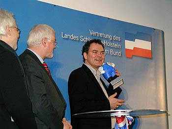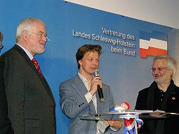 Ministerpräsident Peter Harry CarstensenSo freute sich Carstensen, gemeinsam mit Bernd-Günther Nahm, Geschäftsführer der Kulturellen Filmförderung S.-H., und der MSH-Geschäftsführerin Christine Berg nach der Premiere im letzten Jahr auch 2006 zwei „Seebären“ an zwei preisgekrönte schleswig-holsteinische Filmemacher vergeben zu können. Allerdings, so scherzte Carstensen, eine seiner „ersten Reformen“ bei Regierungsantritt sei gewesen, dass „die Seebären ab sofort lächeln“.